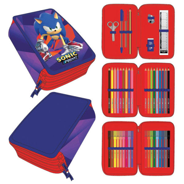 pernica puna; 3 zipa; sadrži: 18 drvenih bojica, 18 flomastera, 2 hemijske olovke, gumica, makazice, raspored časova i rezač; 100% poliester; dimenzija: 12,5x18,5x6,5 cm