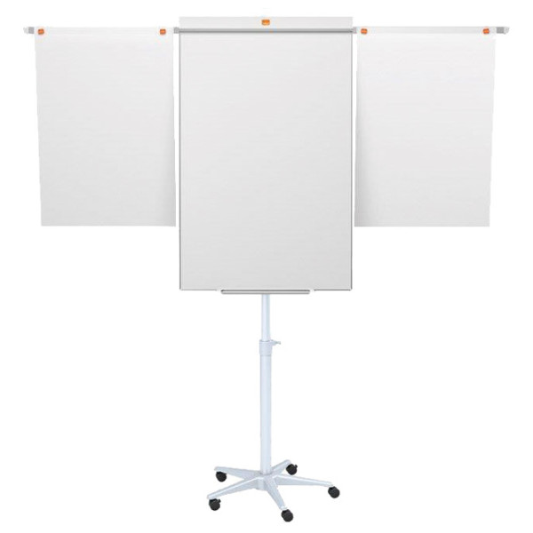 bela tabla: 70x100 cm; magnetna; na donjem delu polica za odlaganje magneta i olovaka; dodatni držači omogućavaju prikaz 3 prezentacijska lista u isto vreme; podesiva visina; stalak je mobilan sa točkićima; garancija 5 godina
